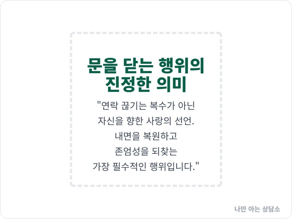 그러므로 ‘연락 끊기’는 복수나 증오의 표현이 아니다. 이것은 당신 자신을 향한 가장 깊고 절실한 사랑의 선언이며, 당신의 파괴된 내면 세계를 복원하기 위한 첫 번째이자 가장 필수적인 건축 행위다.
