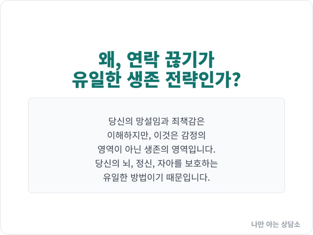 당신이 느끼는 망설임과 죄책감에도 불구하고, 연락 끊기가 절대적으로 필요한 이유는 그것이 당신의 뇌와 정신, 그리고 당신의 자아를 보호하는 유일한 방법이기 때문이다. 이것은 감정의 영역이 아니라, 생존의 영역이다.