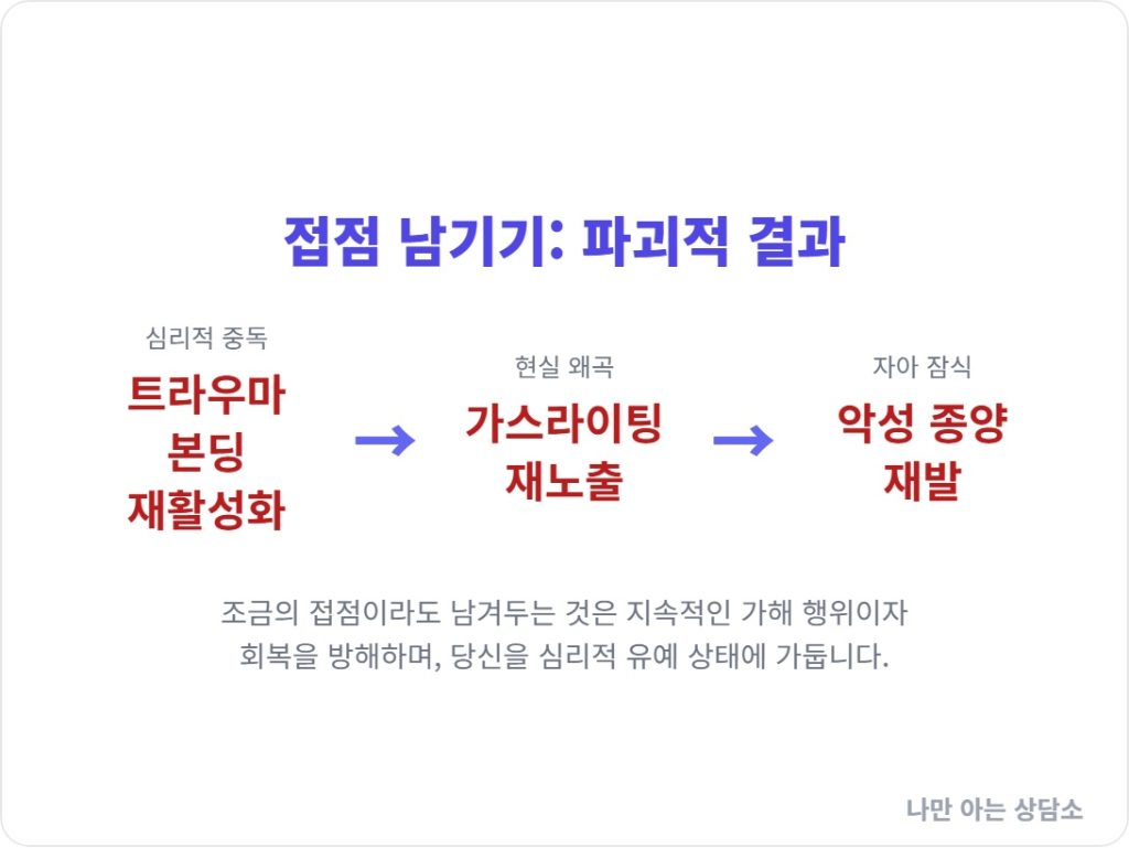이런 상황에서 그와의 어떤 형태의 접촉이든, 그것은 오염원에 당신을 다시 노출시키는 행위다. 그의 안부를 묻는 짧은 문자 속에서도, 당신은 그의 숨겨진 의도를 파악하려 애쓰며 당신의 판단력을 소모할 것이다.