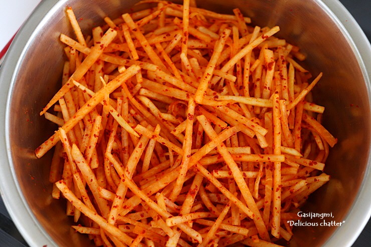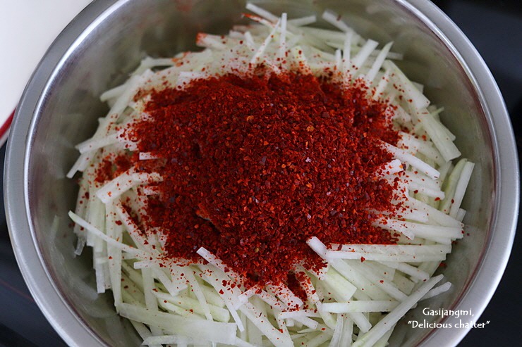 채 썬 무에 고춧가루를 넣고 섞어 7 ~ 8분 정도 두세요.