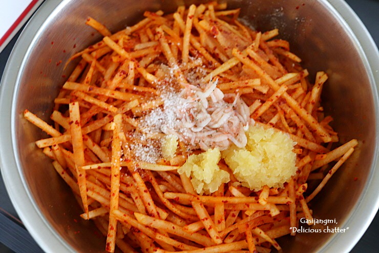 고춧가루가 이쁜 색상으로 무를 물들이면