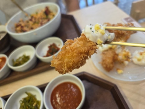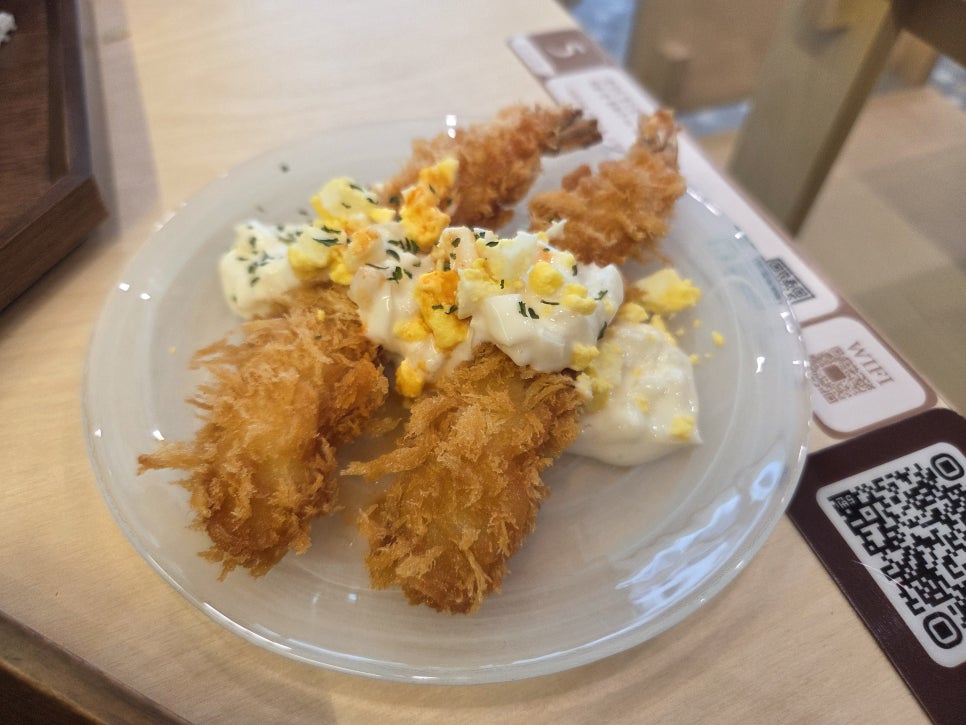오치교반에서 시켜본 새우튀김. 2마리에 5천원이었는데, 얹어져서 나온 소스가 마요네즈에 양파에 계란으깬거. 너무 맛있다… 진짜 훌륭한 요리다. 그냥 튀김이 아니었어…
