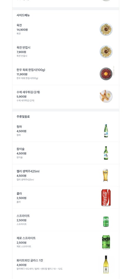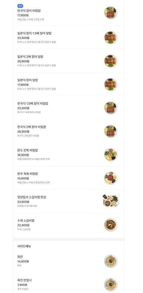 -일본식장어덮밥,한국식장어덮밥,완도전복비빔밥,한우육회비빔밥,영양밥과소갈비찜한상,수제소갈비찜,육전,수제새우튀김,한우육회한접시 등등