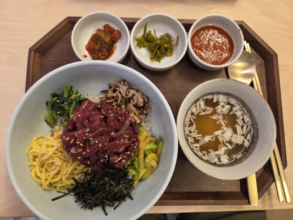 우선, 육회가 잔뜩 얹어져서 나와서 놀랬다. 육회듬뿍비빔밥이라니!!! 굿굿. 훌륭해!!!!!!