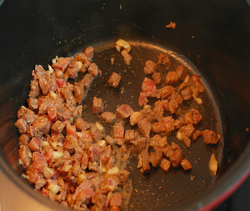 5. 참기름 두른 팬에 소고기와 다진 마늘을 넣고 볶아주세요.