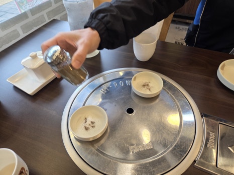 그럼 먹기전에 소금소스 만들어볼까! 죽염과 후추섞은 종지안에 삼계탕국물을 2스푼정도 넣어서 섞어준다. 그리고 이거를 닭살을 발라서 찍어서 먹으면 되는 것.