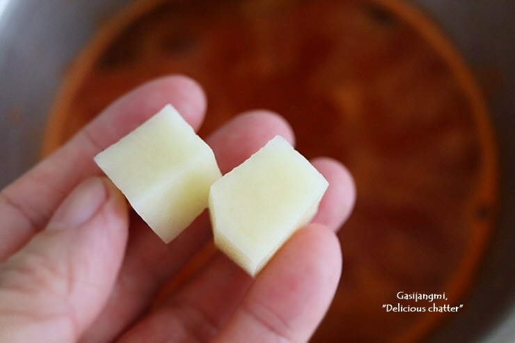 끓으면 감자를 넣고 반 정도 익을 때까지 끓여주세요.