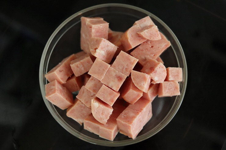 스팸은 먹기 좋게 잘라 뜨거운 물을 끼얹어 물기를 빼주세요.